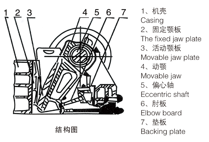 該系列破碎機(jī)工作方式為曲動(dòng)擠壓型,其工作原理是:電動(dòng)機(jī)驅(qū)動(dòng)皮帶和皮帶輪,通過偏心軸使動(dòng)顎上下運(yùn)動(dòng),當(dāng)動(dòng)顎上升時(shí)肘板與動(dòng)顎間夾角變大,從而推動(dòng)動(dòng)顎板向固定顎板接近,與其同時(shí)物料被壓碎或劈碎,達(dá)到破碎的目的;當(dāng)動(dòng)顎下行時(shí),肘板與動(dòng)顎夾角變小,動(dòng)顎板在拉桿,彈簧的作用下,離開固定顎板,此時(shí)已破碎物料從破碎腔下口排出。隨著電動(dòng)機(jī)連續(xù)轉(zhuǎn)動(dòng)而破碎機(jī)動(dòng)顎作周期運(yùn)動(dòng)壓碎和排泄物料,實(shí)現(xiàn)批量生產(chǎn)。